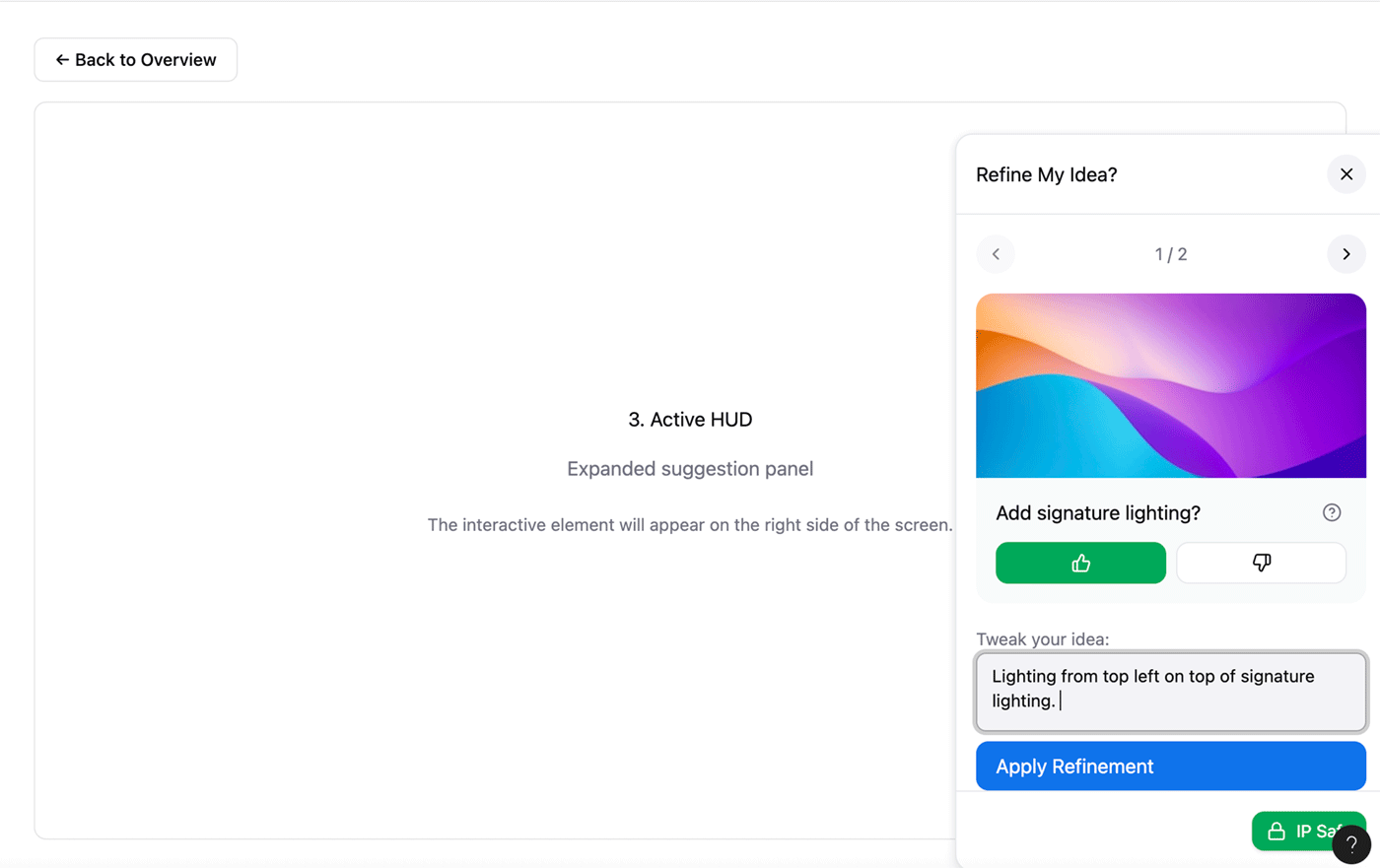 Prototype: On CTA click → Transition to Idle Overlay (dissolve 0.3s);
