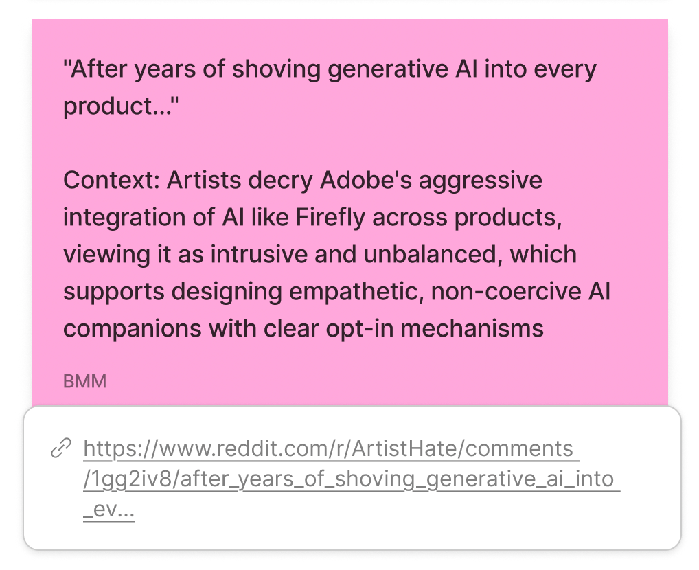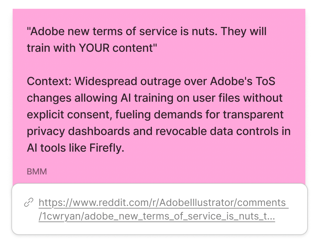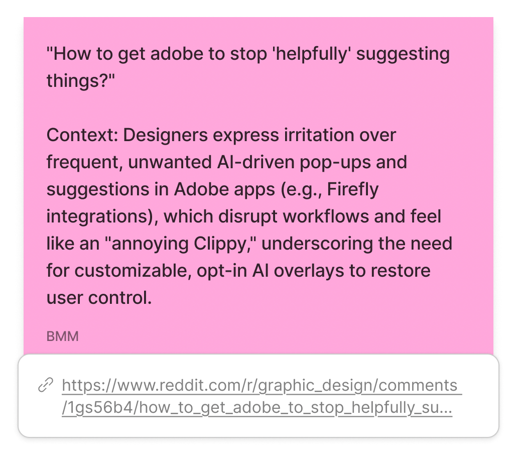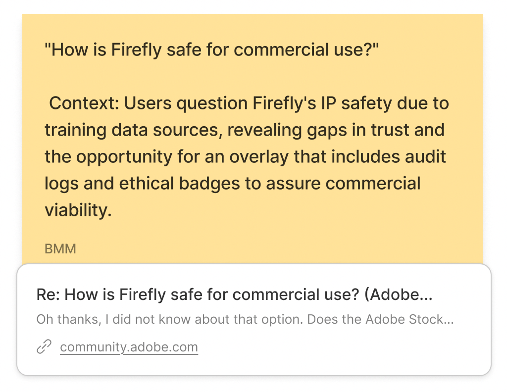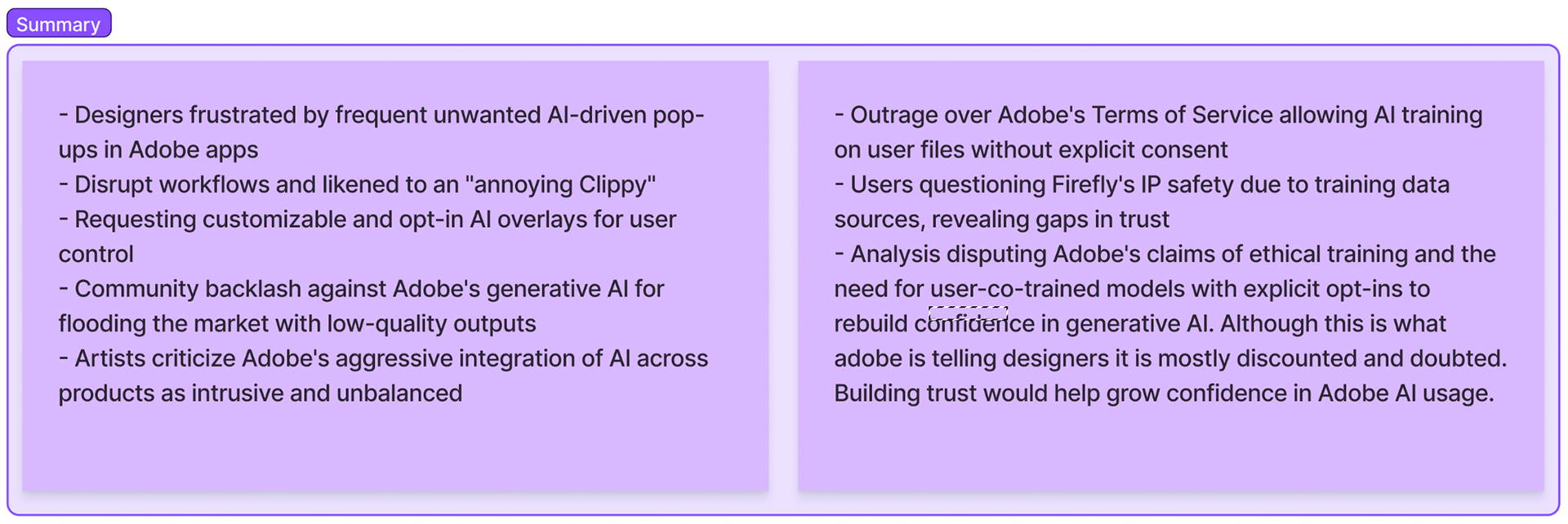 Adobe's Firefly AI, while innovative for generative tasks in tools like Photoshop, faces user frustrations, including intrusive suggestions (often likened to an "annoying Clippy"), poor prompt interpretation leading to wasted credits, and ethical concerns over intellectual property (IP) rights and data training without explicit consent. These issues contribute to workflow disruptions, trust erosion, and potential churn among freelance designers and pros, as evidenced by research from 2025 feedback on Reddit and X highlighting bloated interfaces and (IP) fears. Buzz Mack Media needs to create trust and prevent lost work and time for users to enhance Adobe Firefly in Photoshop or the Firefly web app, without disrupting the main canvas.