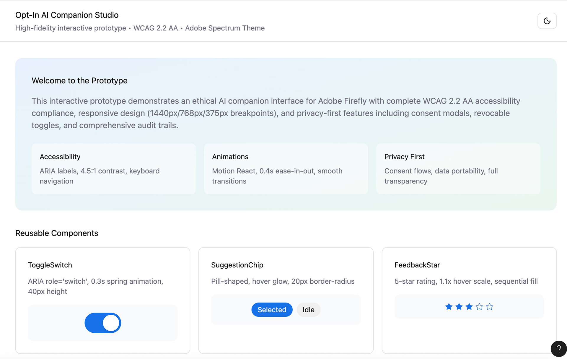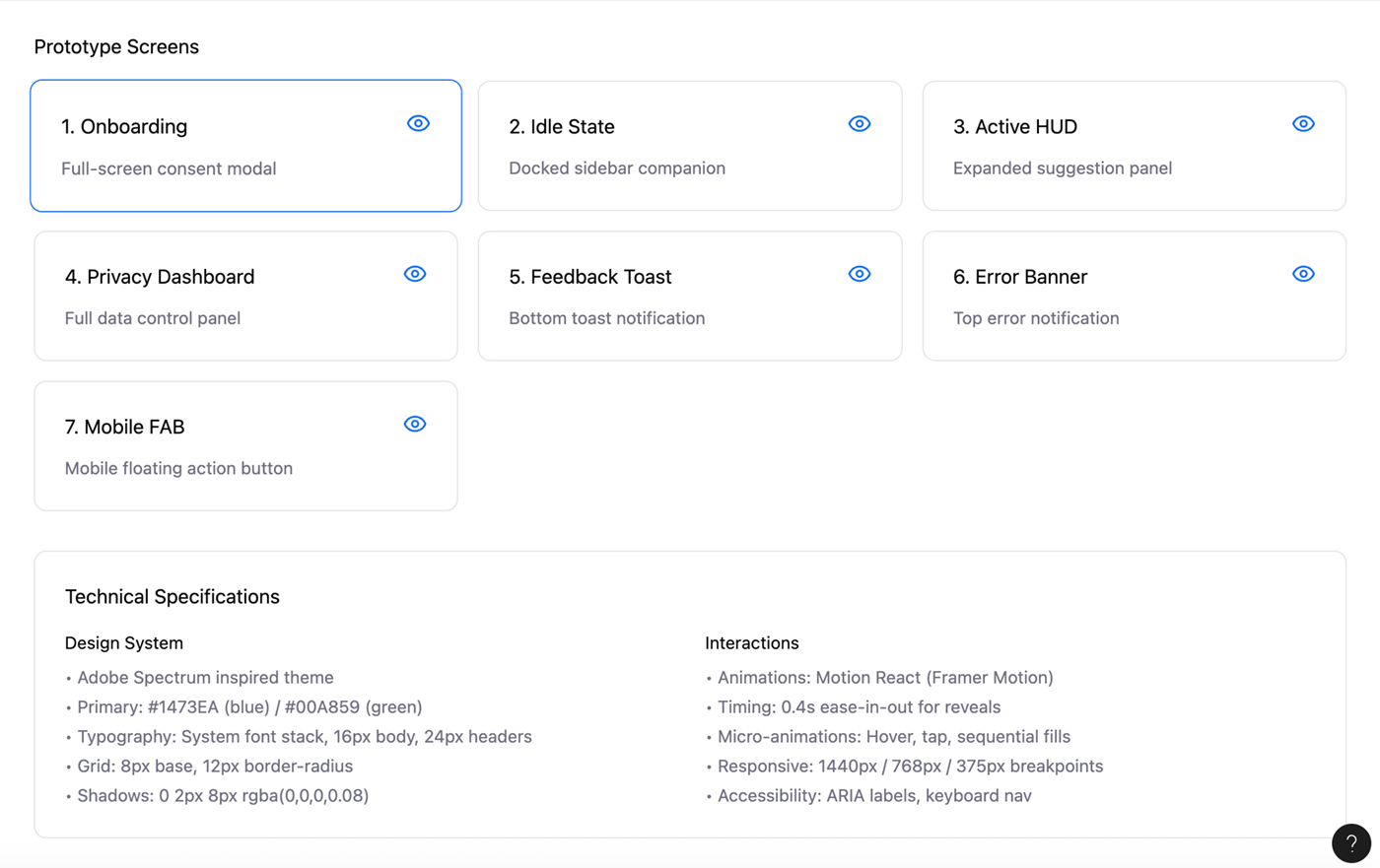 Conducted deep research via X, Reddit, and Adobe forums to identify pain points, synthesizing insights into user personas (e.g., frustrated freelancer). Develop high-fidelity design prompts optimized for the Figma prototyping ecosystem, focusing on ethical overlays with opt-in flows, micro-animations, and WCAG compliance. Iterated the prompt for dev handoff (e.g., Design System Components) and created 7 responsive screens emphasizing consent toggles and contextual HUDs.