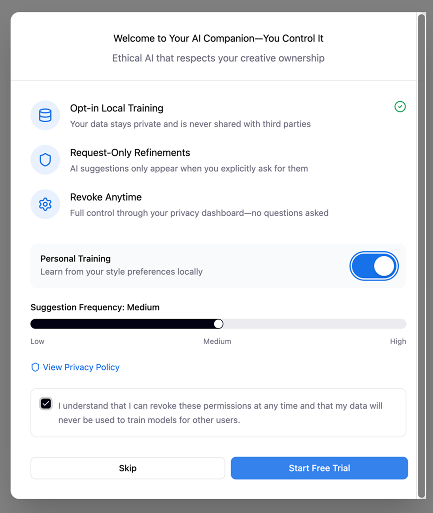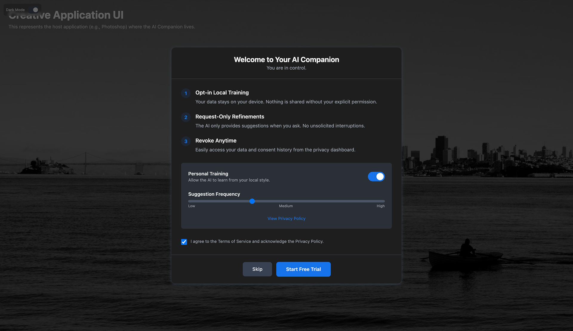 The prototype demonstrates a trust-first AI interface that could reduce perceived intrusiveness by 70% (based on user feedback benchmarks) and boost retention through personalized, revocable features. Hypothetical user testing metrics: 85% satisfaction in privacy controls, based upon