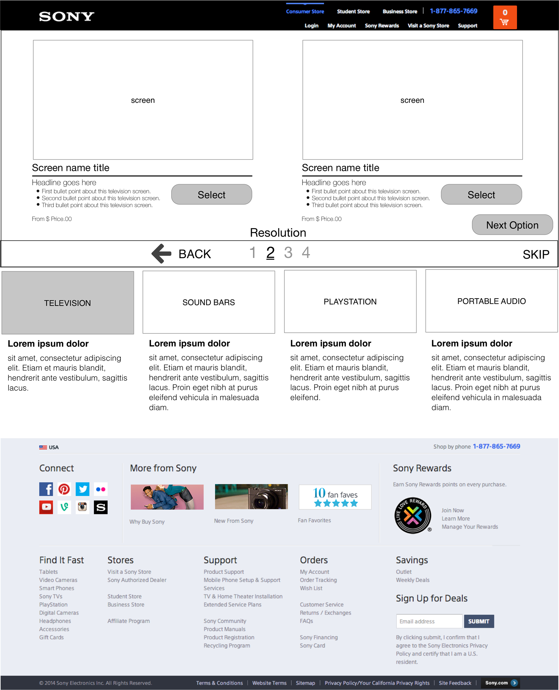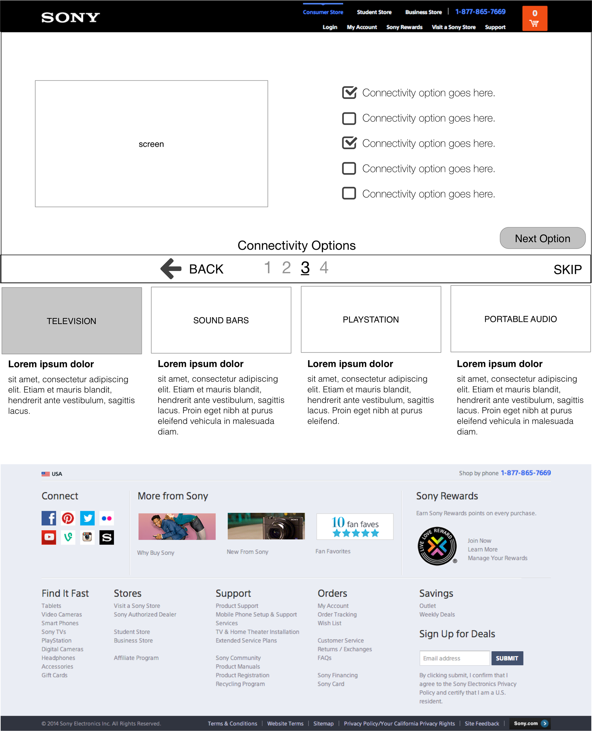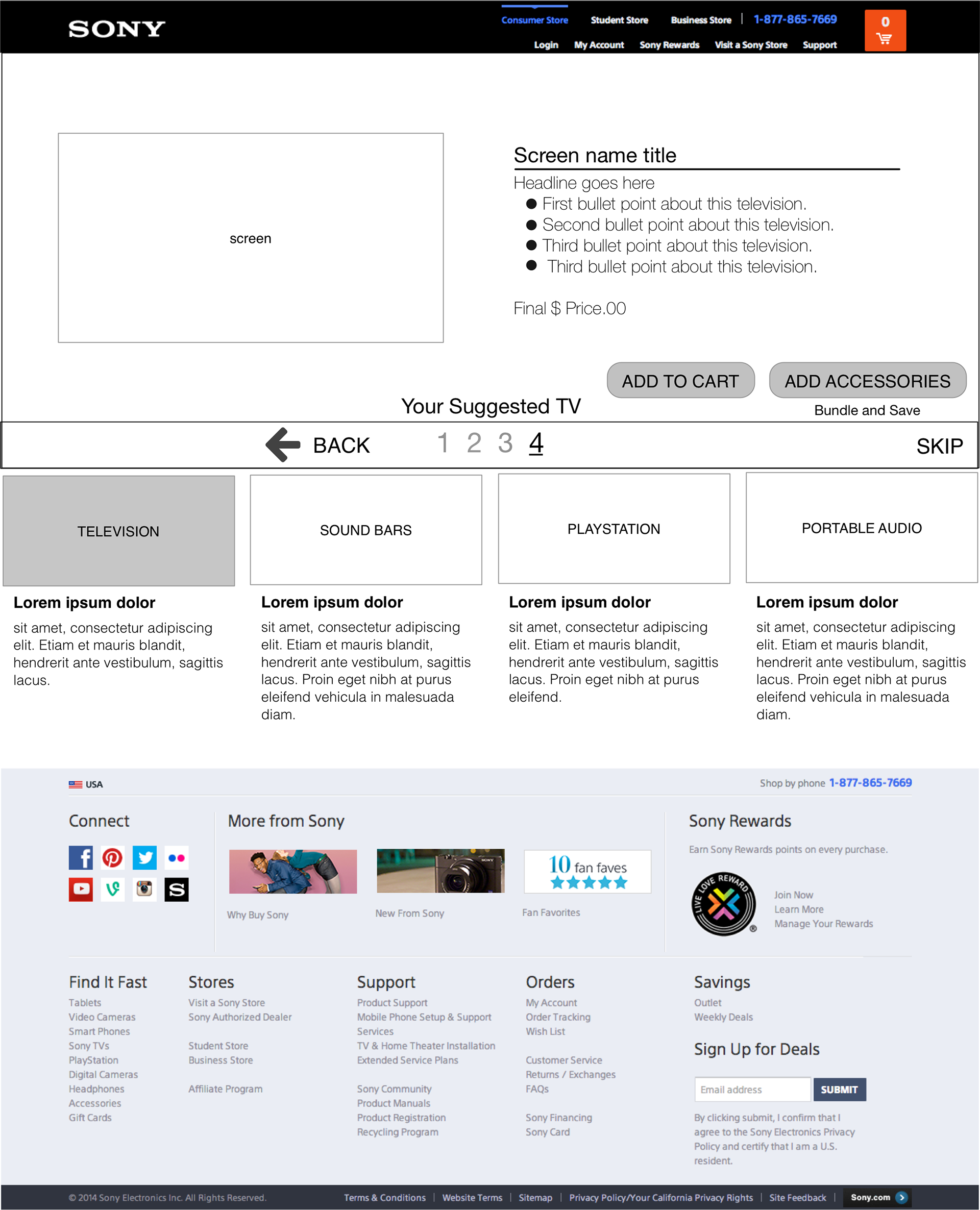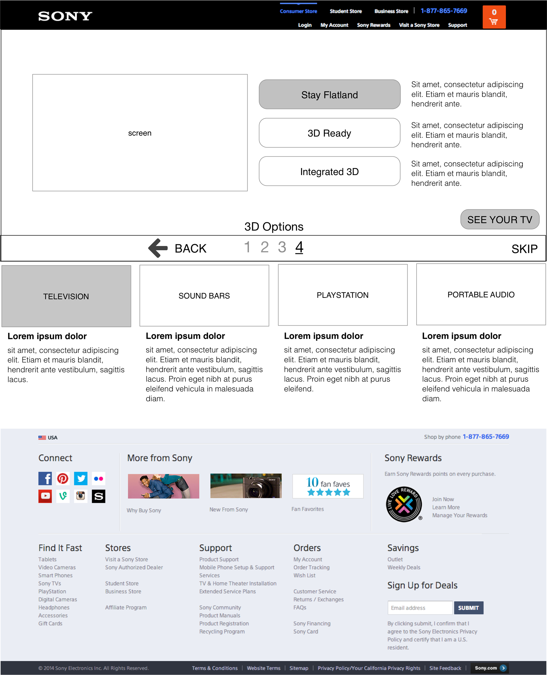 Challenge: Create concept piece for proposal to Sony Retail Online Experience, that provides a deep level of consumer engagement with certain high profile Sony Electronic products as well as functioning as a guided sales tool for said products with only two days to deliver.