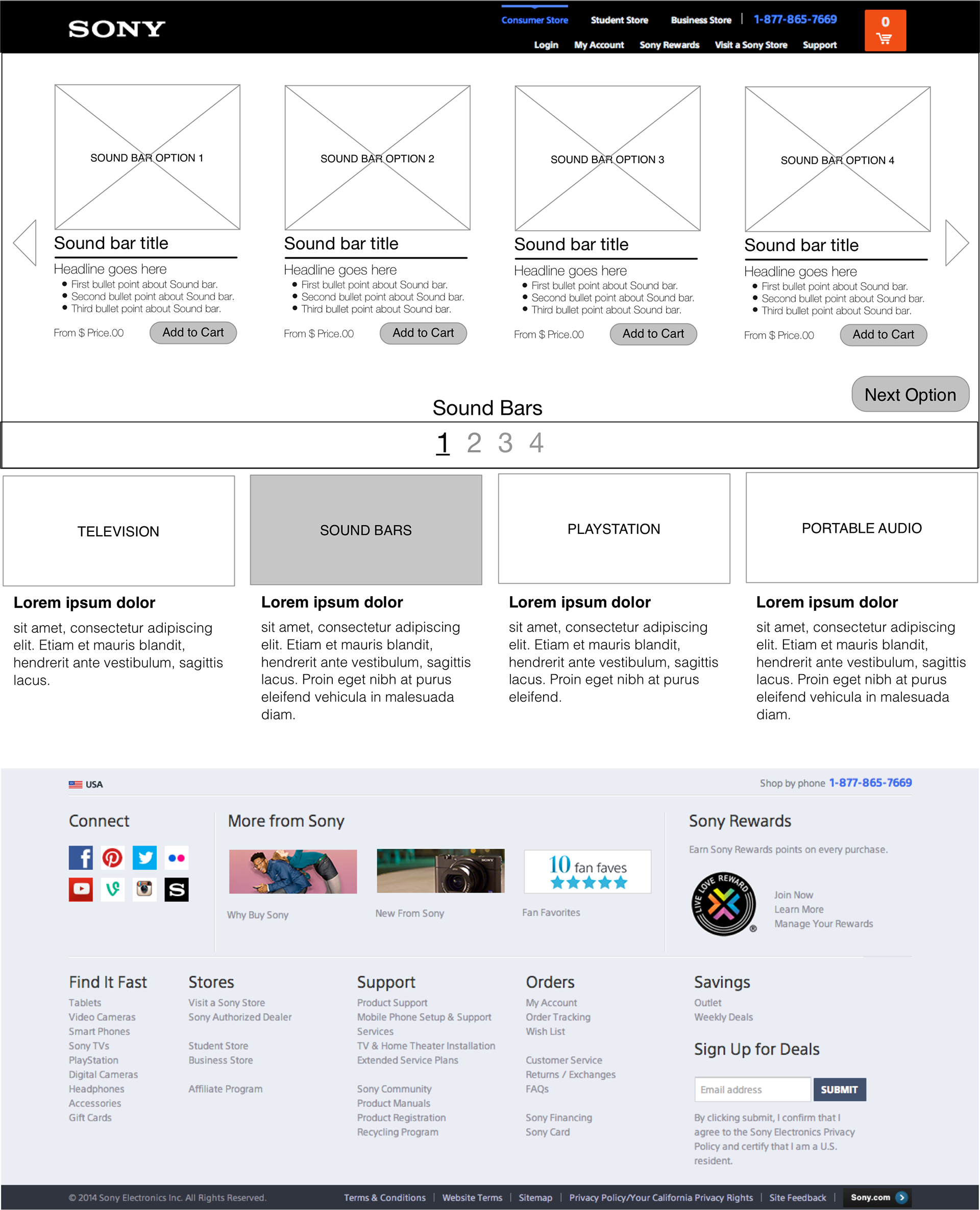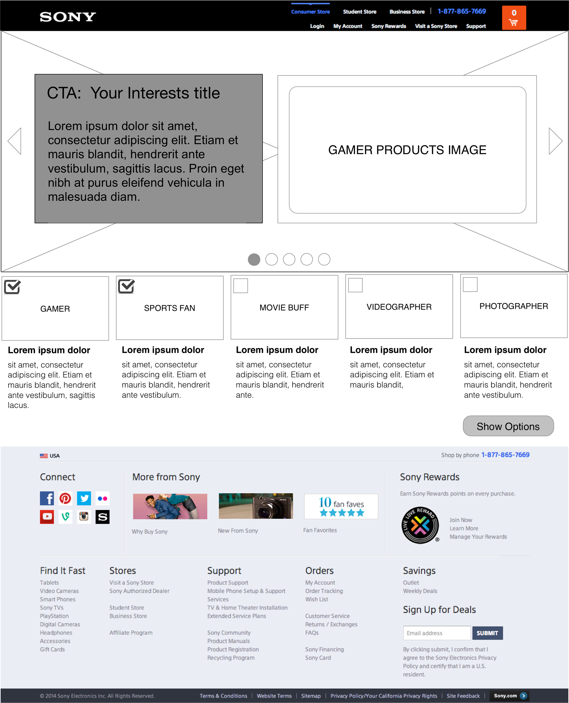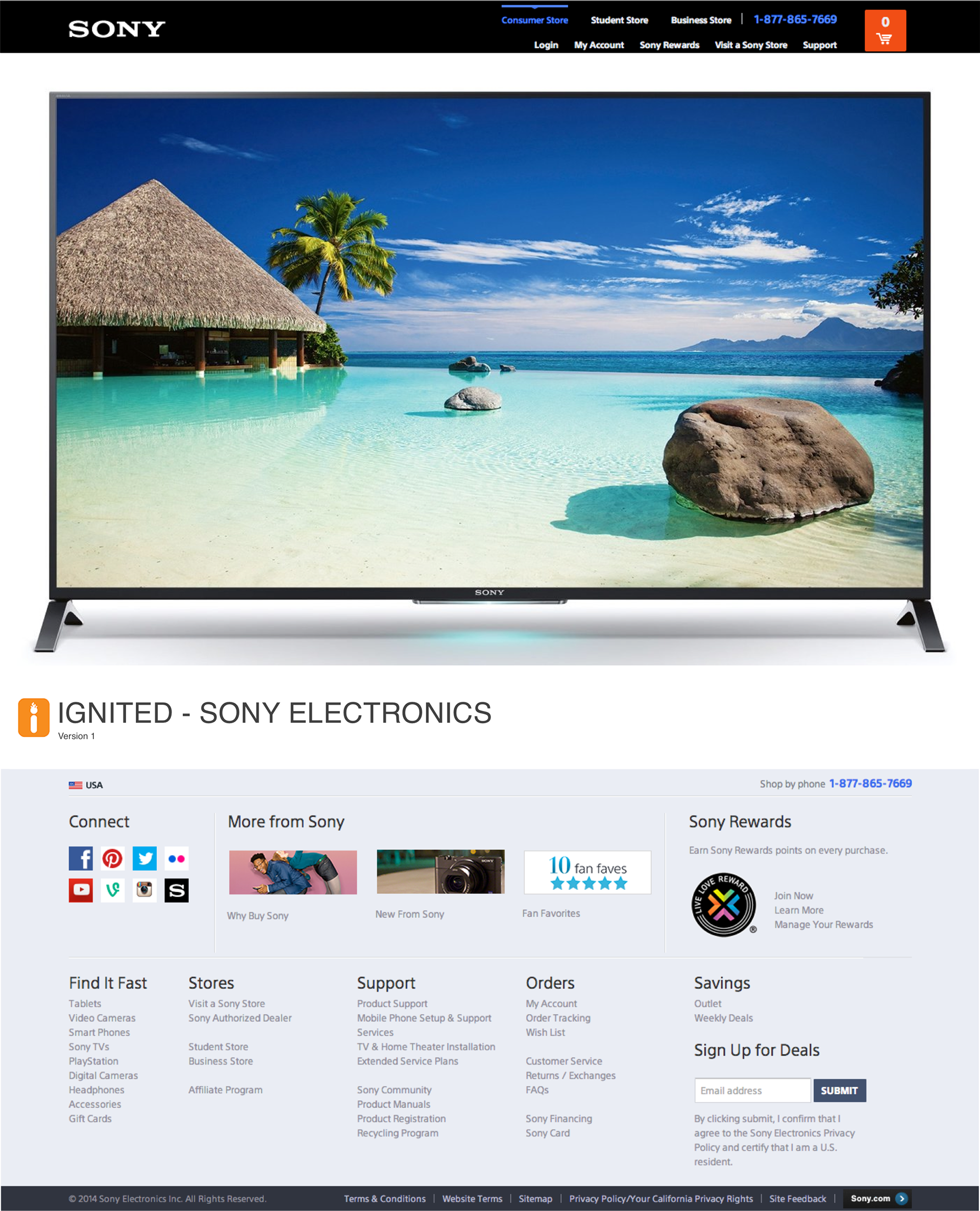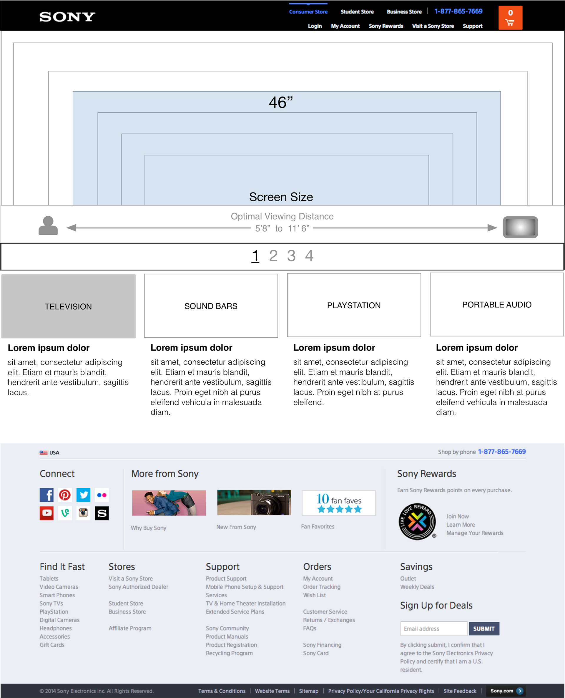Challenge: Create concept piece for proposal to Sony Retail Online Experience, that provides a deep level of consumer engagement with certain high profile Sony Electronic products as well as functioning as a guided sales tool for said products with only two days to deliver.